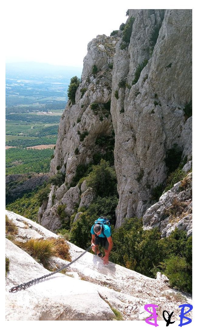 Une ascension de la Ste-Victoire par la marbrière, refuge Baudino, le Grand Couloir équipé de câbles et chaînes, la crête et descente par le sentier noir au Col de Vauvenargues.