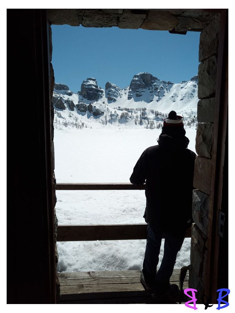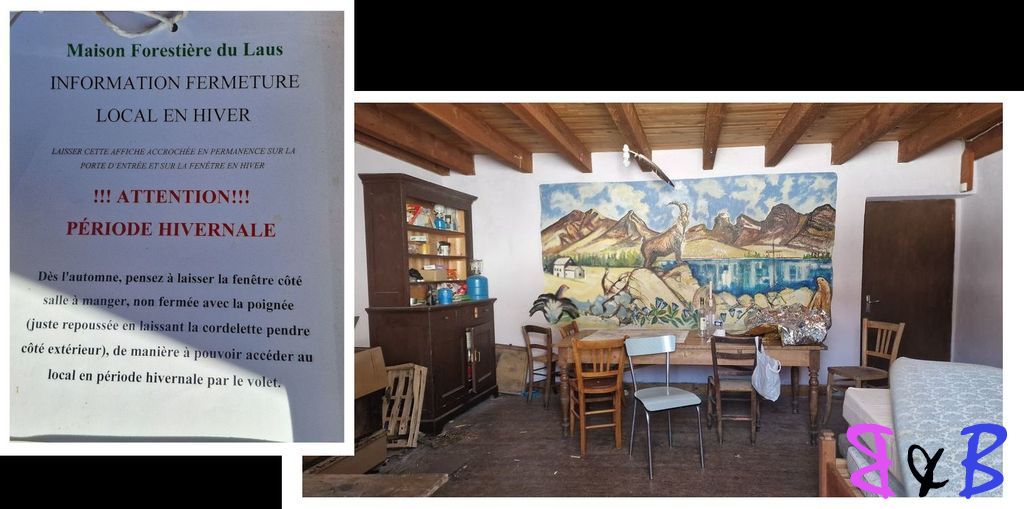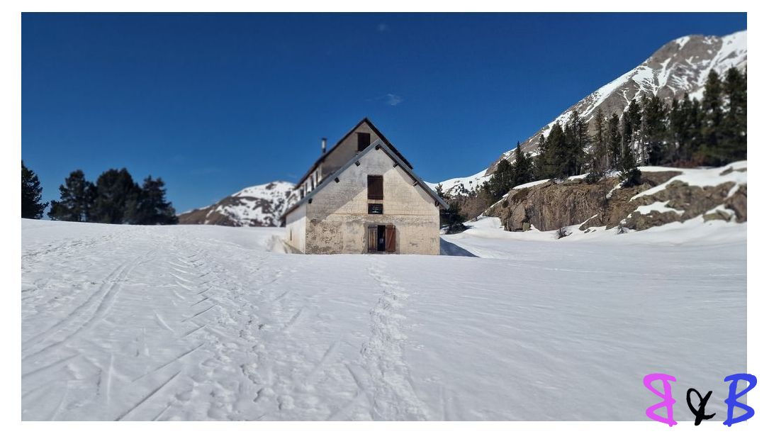 Le refuge est pratiquement enseveli sous la neige, on ne distingue plus la terrasse.