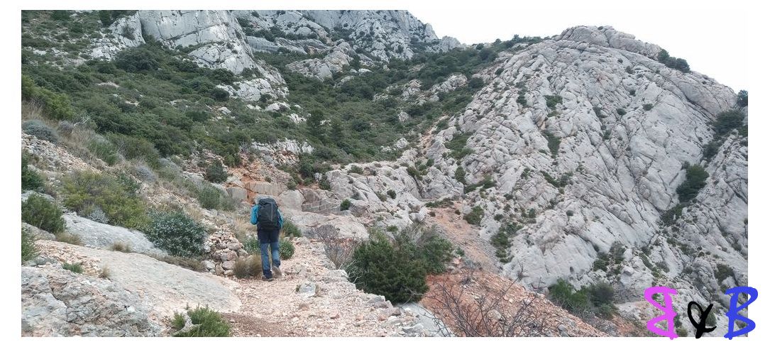 La descente est assez raide au milieu des blocs rocheux.