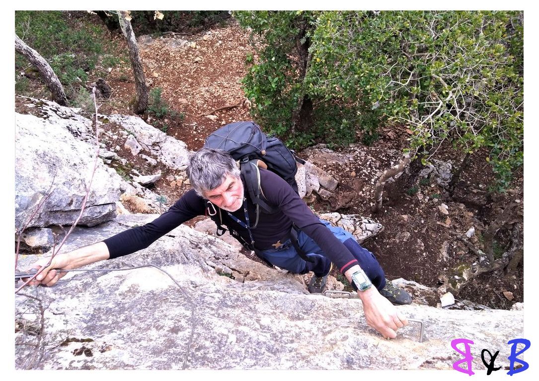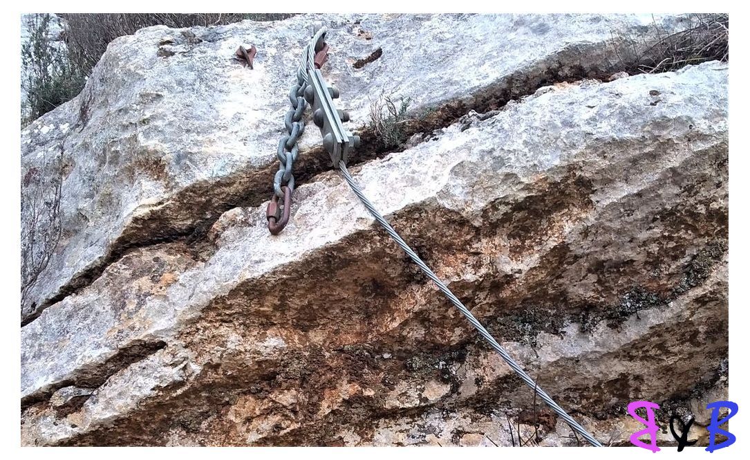 Le sentier descent fort et arrive sur un surplomb rocheux équipé de câbles et de cales.