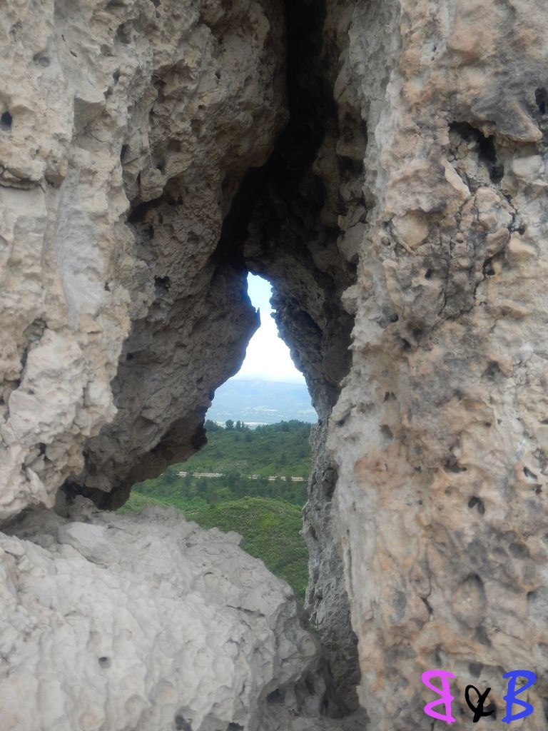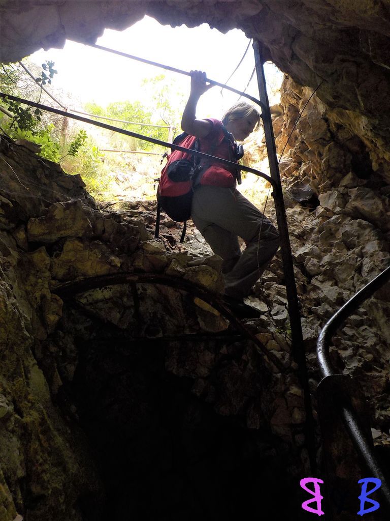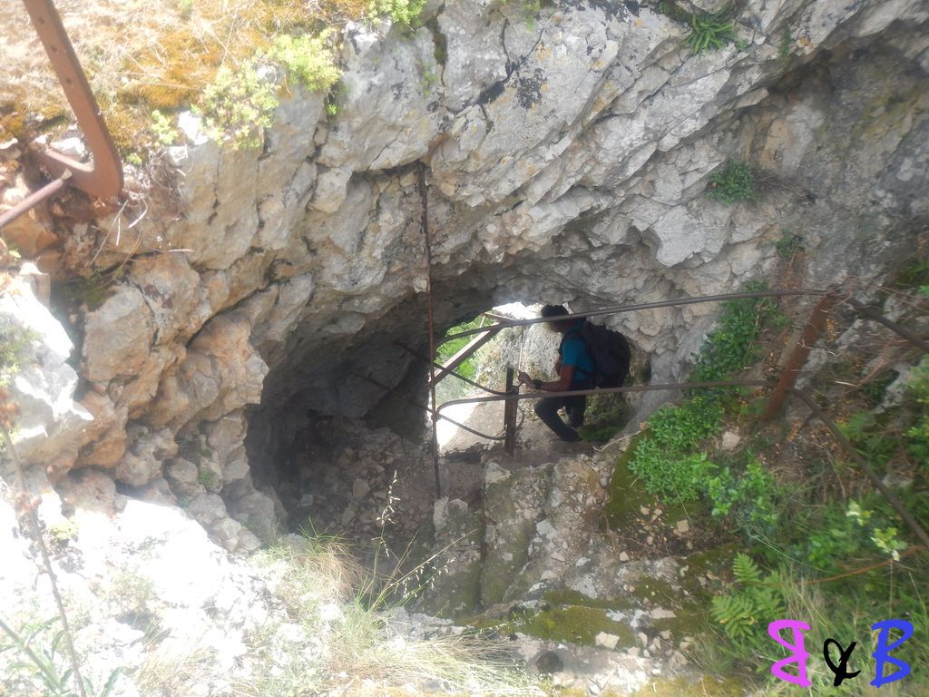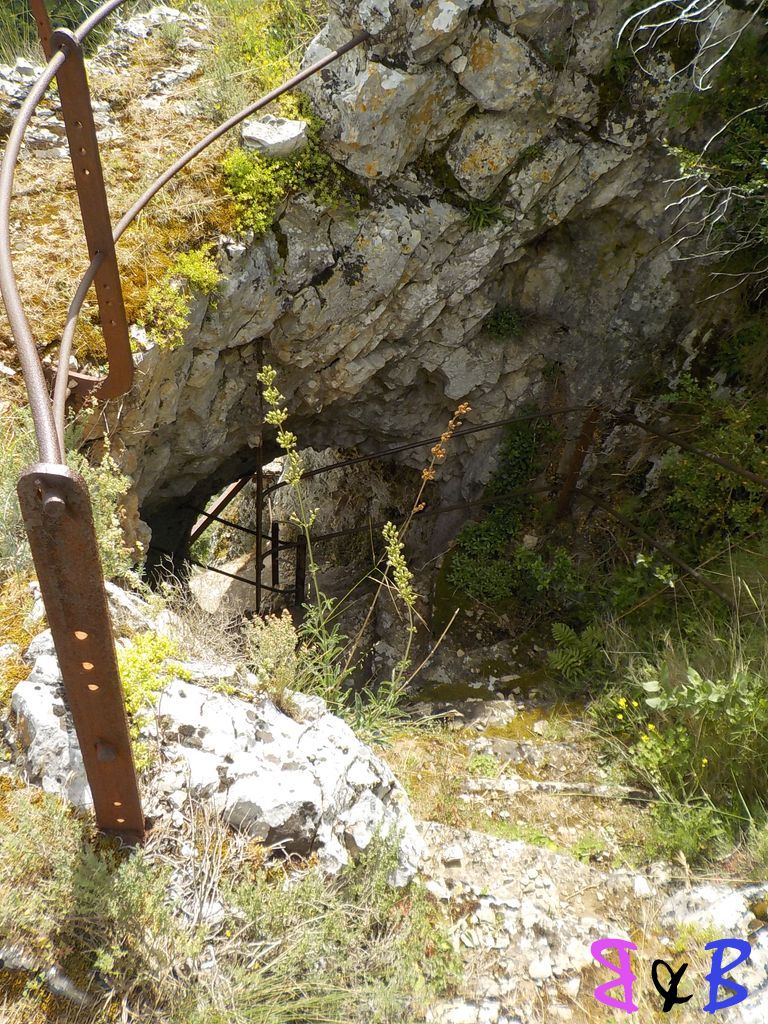 De précaires rambardes métalliques collent à la paroi de la colline pour permettre d’atteindre un trou ovale dans la paroi rocheuse.